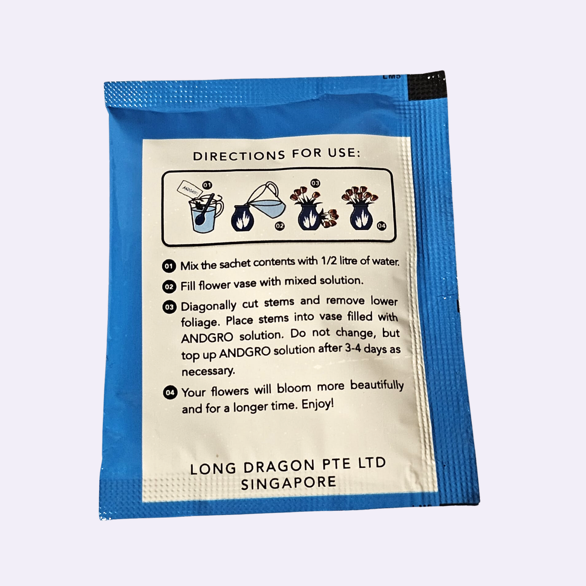 Mix the contents of 1 packet of ANDGRO Cut Flower Food with 0.5 litre of water. Fill clean container with solution. Remove foliage from stem which is below water line. Cut flower stem diagonally. Place in container and enjoy!